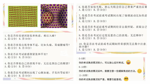 接下来心理委员为同学们介绍了什么叫考试焦虑,考试焦虑的成因——来自外部环境,内部心理等种种因素——同时分享了一系列欢乐迎考的策略。