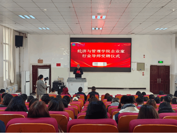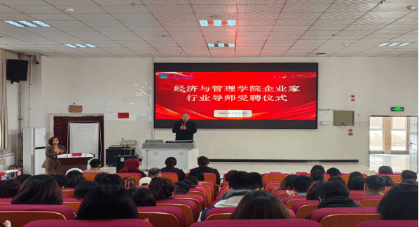 为深化产教融合、服务新疆高质量发展,2025年3月19日,经济与管理学院在经管楼100报告厅举行校企合作受聘仪式。校外嘉宾(喀什经济开发区兵团分区招商局长赖俊钦、喀什市裕鸿房地产开发有限公司总经理马峰、新疆丝路丰程国际物流有限公司董事长王风、康意数码电器公司总经理尹经伍、空气能工厂总经理何灵、雨花石影业公司总经理张晓、美顺科技公司总经理罗海旋、抖喀什传媒公司总经理齐帅、立马摩托车公司总经理艾散江)、学院领导(学院党委副书记、院长罗怀敬,党委副书记、纪委书记贺波,副院长热比亚·吐尔逊,副院长邓雪琴)、学院援疆教师代表(张双娜)以及学院各系各专业师生代表一同出席和参加了受聘仪式现场活动,活动由学院党委副书记、副院长阿依古丽·阿布都热西提主持。