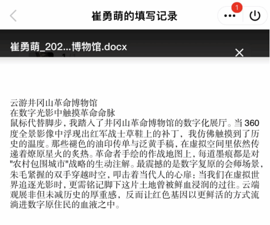 活动伊始,负责人将云游红色基地的网址发送给参与活动的同学们,并将要求一并发送。接着,同学们根据线上云游红色基地的网站中的历史实物、影像资料等,深入了解共产党人艰苦奋斗、奋发图强的革命历史。以此写下自己的观后感,并将其上传至收集表中。同学们都积极参与,发表了属于自己的独特见解,上传了对革命先烈们深厚的敬意,在此次云游过程中,我们缅怀革命先辈,坚定理想信念,传承革命薪火。