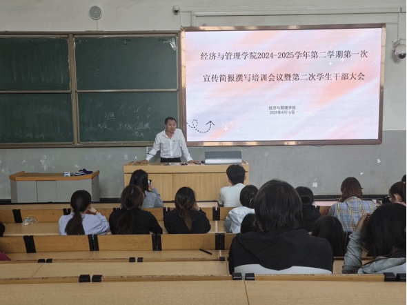 为进一步提升学院宣传工作质量,提升学生干部工作能力,加强学院宣传队伍建设。喀什大学经济与管理学院于2025年4月16日在新泉校区二教B110召开了2024-2025学年第二学期第一次宣传简报撰写培训会议暨第二次学生干部大会。学院党委副书记贺波、学工办副主任贾贵娟、辅导员老师钱红、新泉校区全体学生干部及高台校区学生会宣传部干事参加会议。