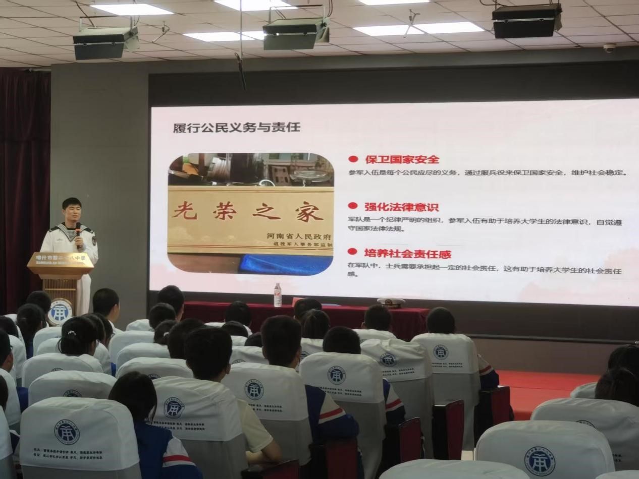 活动伊始,张旭琦以亲身经历为切入点,结合图文讲述,向同学们展现了丰富多彩的部队生活。在知识宣讲环节,张旭琦详细介绍了参军入伍的条件、报名流程、优惠政策以及未来发展路径,让同学们对参军有了全面而深入的了解。针对同学们关心的问题,如入伍后学业如何安排、退役后的就业保障等,都一一给予了耐心细致的解答。