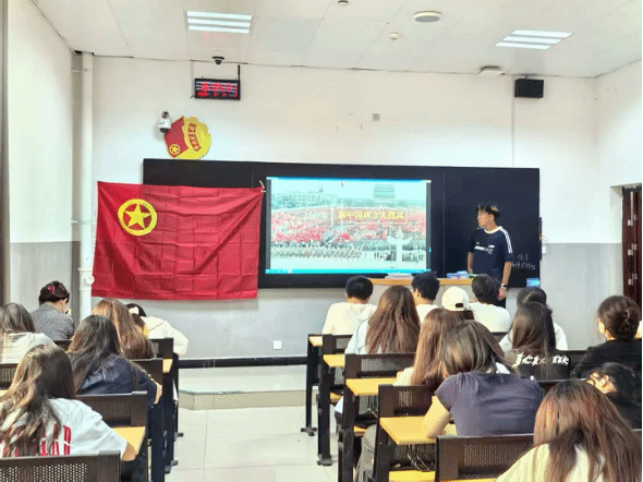 为深入开展爱国主义教育,引导青年学子铭记历史、缅怀先烈,经济与管理学院跨境电子商务2414班团支部于2025年9月3日,在新泉校区2号教学楼B107教室组织全班同学观看了在北京举行的中国人民抗日战争暨世界反法西斯战争胜利80周年阅兵式。