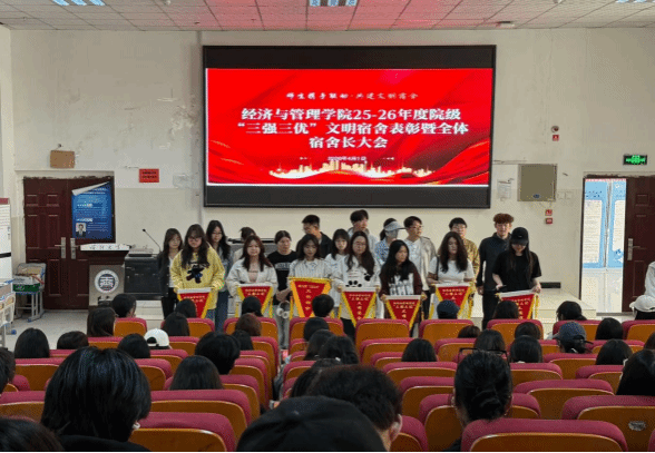 为进一步加强学院宿舍文明建设,营造安全、整洁、和谐的宿舍生活氛围,充分发挥优秀宿舍的示范引领作用,4月1日,经济与管理学院在经管楼100报告厅召开2025-2026年度院级“三强三优”文明宿舍表彰暨全体宿舍长大会。学院全体宿舍长参会,会议围绕文明宿舍表彰、宿舍管理规范等核心内容展开。