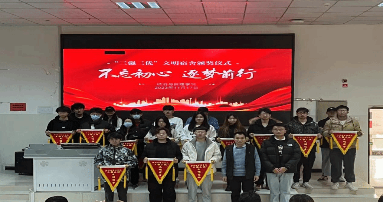 为深入贯彻落实习近平总书记加强高校大学生思想政治工作和德智体美劳全面发展工作要求,进一步推进我院文明宿舍建设,加强学生的文明修养,陶冶个人情操,营造温馨舒适的宿舍氛围,通过宿舍这一重要育人阵地,全方位加强学生思想政治教育,为广大学生营造优越的学习生活环境,经济与管理学院2023年11月17日在经管楼100报告厅举行了“三强三优”文明宿舍颁奖仪式,学院党委副书记贺波、辅导员王嘉禹、获奖宿舍代表参加了此次大会。