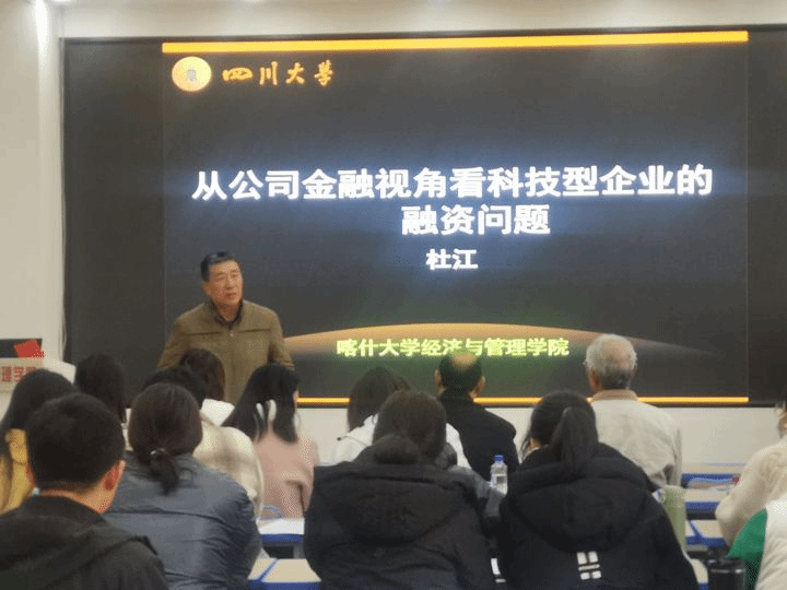 2023年11月22日,喀什大学经济与管理学院开启了2023慕峰经管论坛第十三讲,由银龄教授杜江做了《从公司金融视角看科技型企业的融资问题》的报告,学院全体教师及部分学生参加。