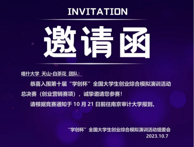 2023年10月22日喀什大学经济与管理学院“天山白茶花”团队(学生:李金雨、何学华、朱子涛)参加了由高等学校国家级实验教学示范中心联席会经济与管理学科组、中国陶行知研究会主办,杭州贝腾科技有限公司支持的“学创杯”全国大学生创业综合模拟演训活动(创业营销赛项)总决赛,与来自全国160所高校的800余名参赛师生选手齐聚南京同台竞争,最终在总决赛中取得全国总决赛一等奖,展示了喀大学子专业水平以及良好的精神面貌。