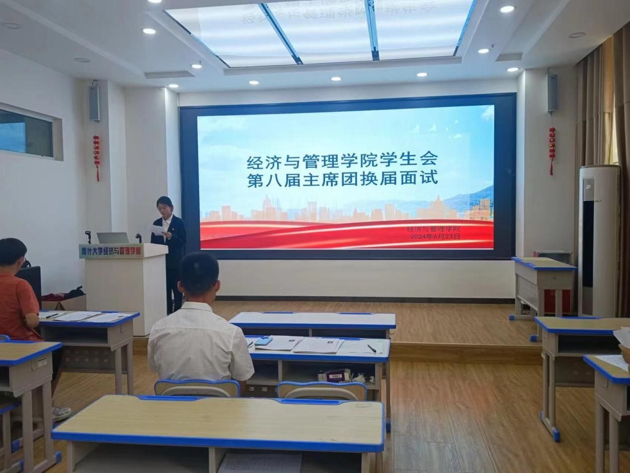为使学生会工作保持连续性和发展性,推动经济与管理学院工作的不断进步。6月23日18:00,经济与管理学院学生会主席团换届面试在经管楼208隆重举行。此次面试旨在选拔出卓越的领导人才,引领学生会迈向新的辉煌。此次面试由学院辅导员老师以及上届学生会主席团成员组成的专业评审团,以严谨公正的态度审视每一位候选人。