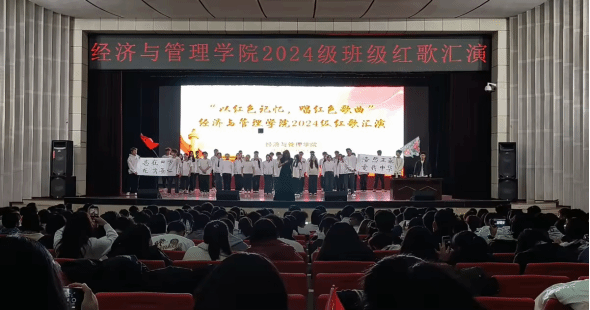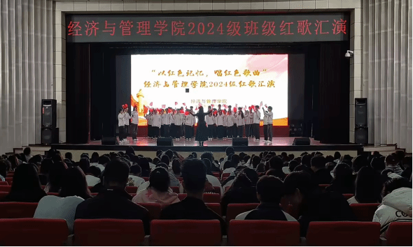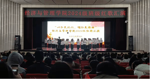 为了弘扬红色精神,传承红色文化,增强学生的爱国精神,拉近人与人之间的距离,加强群体凝聚力和认同感。喀什大学经济与管理学院于2024年11月16日在高台校区科学会堂成功举办了一场红歌汇演,24级各班在此次汇演中展现“五个人人”学习成果,学院辅导员老师以及党员学生代表担任评委。