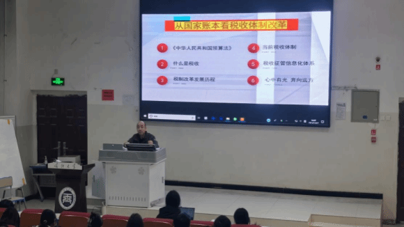 推进产学研融合、政校协同的育人新模式,建立“税校合作”常态化机制2023年12月27日喀什大学经济与管理学院邀请国家税务总局图木舒克税务局党委委员、副局长张俊锋以“从国家账本看税收体制改革”为题开展讲坛,学院师生受益匪浅
