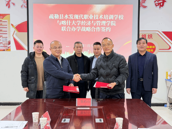在与会人员的共同见证下,疏勒县水发现代职业技术培训学校执行校长涂荣清与学院苏洋副院长分别代表双方单位,正式签署了联合办学战略合作协议。签约后,双方代表合影留念,记录下这一重要时刻。
