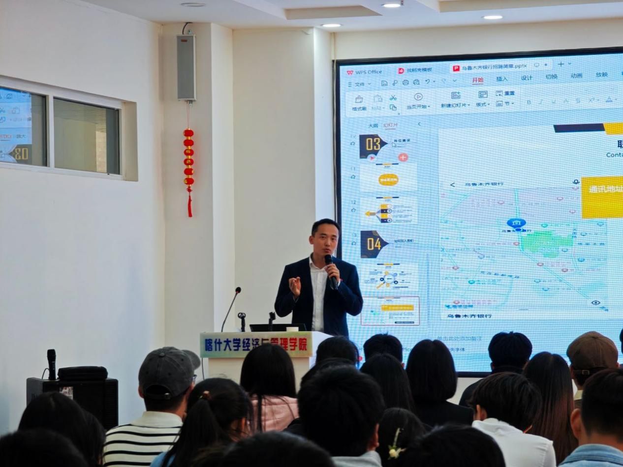 活动伊始,由乌鲁木齐银行刘东方为毕业生们详细介绍了银行的工作内容、工作地点、福利待遇等方面的情况,让同学们对该企业有了更加全面的了解。随后,乌鲁木齐银行负责人分享了乌鲁木齐银行的工作环境和企业文化。至此,招聘会宣讲告一段落进入了互动环。同学们纷纷向代表们提问,其中包括晋升机制、职业发展规划等问题,乌鲁木齐银行团队在了解到同学们的疑问后耐心解答,为他们提供了宝贵的建议和指导。宣讲会结束后,经济与管理学院党委副书记贺波与乌鲁木齐银行喀什分行副行长刘辉进行了深入交流,就后续共建合作基地等事宜达成了共识。