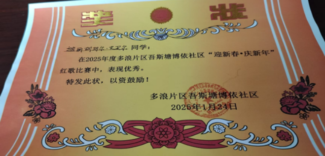 经济与管理学院2309班学生迪丽胡玛尔·艾买尔于2025年1月18日-2025年1月24日期间积极报名参加多浪片区管委会吾斯塘博依社区举办的红歌合唱比赛《爱该同学中华》。