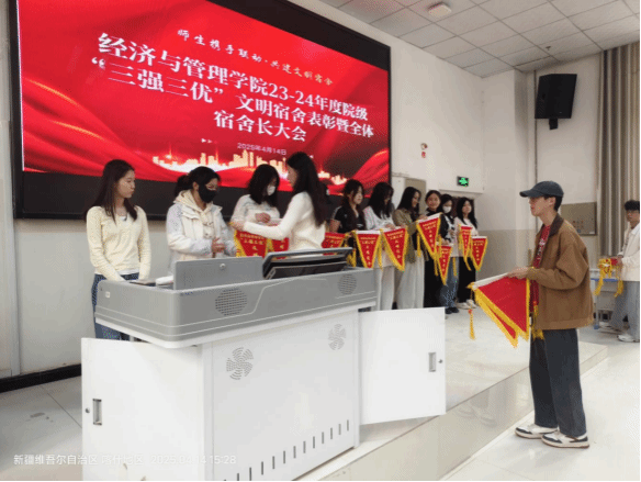 为表彰在宿舍文化建设和管理中表现突出的宿舍,同时进一步强调宿舍卫生和安全的重要性。经济与管理学院于2025年4月14日在经管楼100报告厅进行了2024-2025学年院级“三强三优”文明宿舍表彰暨全体宿舍长大会。本次会议由学院辅导员李翔宇组织开展,新泉校区全体宿舍长参加。