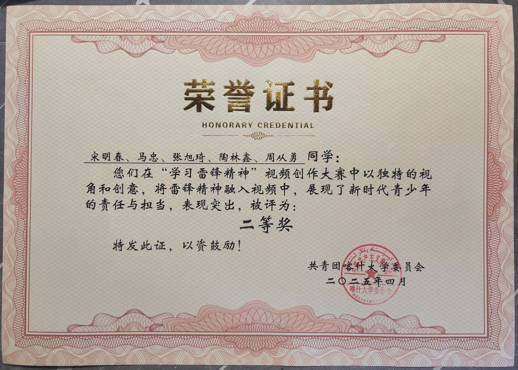 2025年4月15日校园内洋溢着积极向上的氛围,学校举办的雷锋制作视频大赛圆满落下帷幕,众多学子用创意与热情诠释雷锋精神,经济与管理学院经济统计学专业2205班团队凭借出色的作品脱颖而出,荣获校级二等奖。