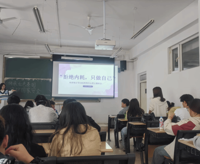 经济与管理学院经济统计学2406班于4月16日举办了一场以“拒绝内耗,只做自己”为主题的心理主题班会,旨在帮助大家减少自我内耗,能够拥有一个更加向上积极的心理状态和自信的内在。