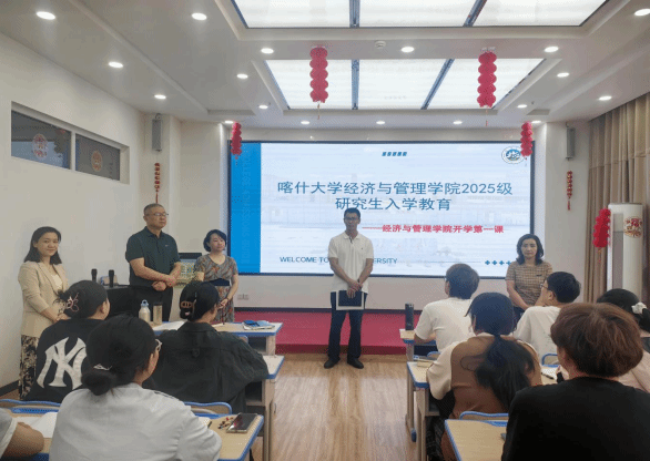 2025年9月15日,经济与管理学院2025级研究生开学第一课在经管楼208教室隆重举行。学院党委副书记、院长罗怀敬,党委副书记、副院长阿依古丽・阿布都热西提,党委副书记王乙,副院长邓雪琴,教师代表张双娜,辅导员陈政党及全体2025级国际商务研究生参会,旨在帮助新生快速适应研究生阶段学习生活、明确学术与职业发展方向,共同开启学术成长新征程。