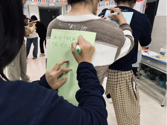 活动现场设置三大特色板块,将家国情怀、中秋情思与自我成长紧密串联,吸引众多同学驻足参与。在“点亮中国”板块,学子们手持彩色便签纸,沿着中国地图方块写下对祖国的深情祝福,一笔一画间满含对山河壮阔的礼赞;校党委学工部副部长米尔阿迪力江·托合提与学工部老师余雪可也参与其中,与参与活动的同学深度交流“中秋月圆”板块里,大家用便签记录对亲友的思念,用彩色画笔勾勒团圆愿景,字里行间皆是牵挂与温情。“心灵寄语”板块则化身传递温暖的心理驿站,学子们不仅为自己写下成长寄语,更向他人传递勇气与鼓励,让积极向上的心理能量在学院内流动,有效增进了彼此间的理解与友情。