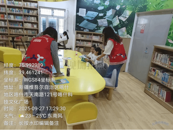 活动首站落地喀什市百姓书房,志愿者们以“服务读者、赋能书香”为主题,迅速投入实践工作。大家分工协作,有序开展图书分类整理、书架规整、借阅流程引导等服务,耐心为老年读者讲解自助借还机操作方法,用行动为读者打造整洁、便捷的阅读环境。