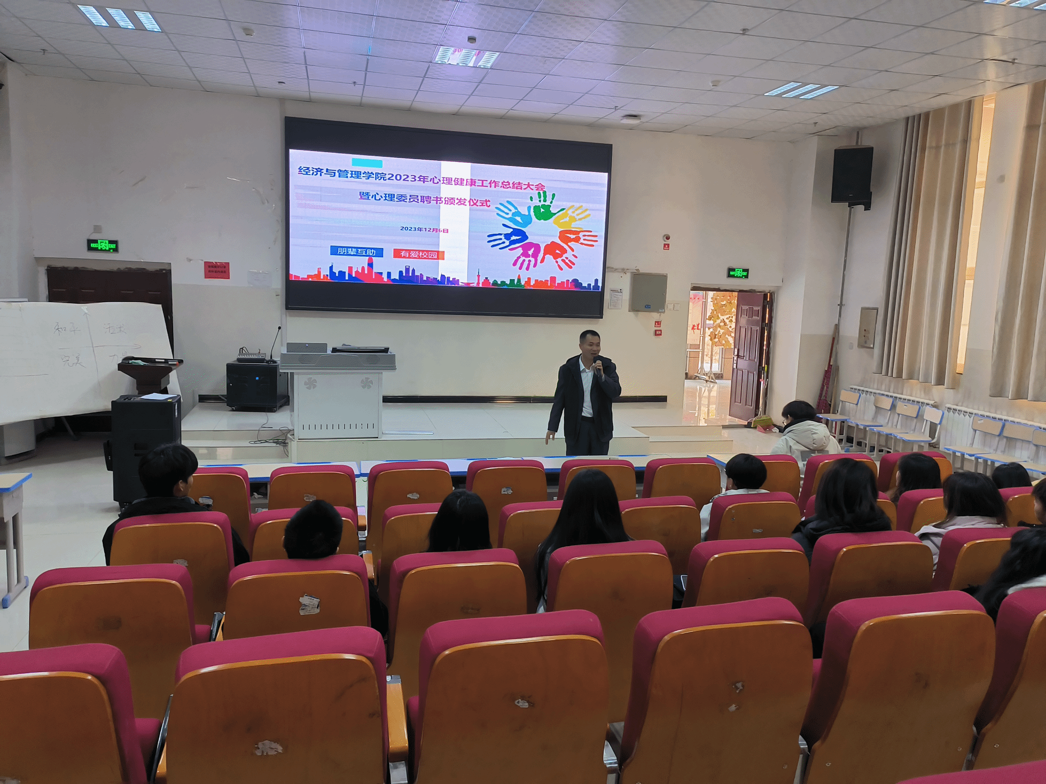 2023年12月6日下午,经济与管理学院举办了2023年心理健康工作总结大会暨心理委员聘书颁发仪式学院新泉校区大二、大三、大四全体心理委员参加了此次大会。