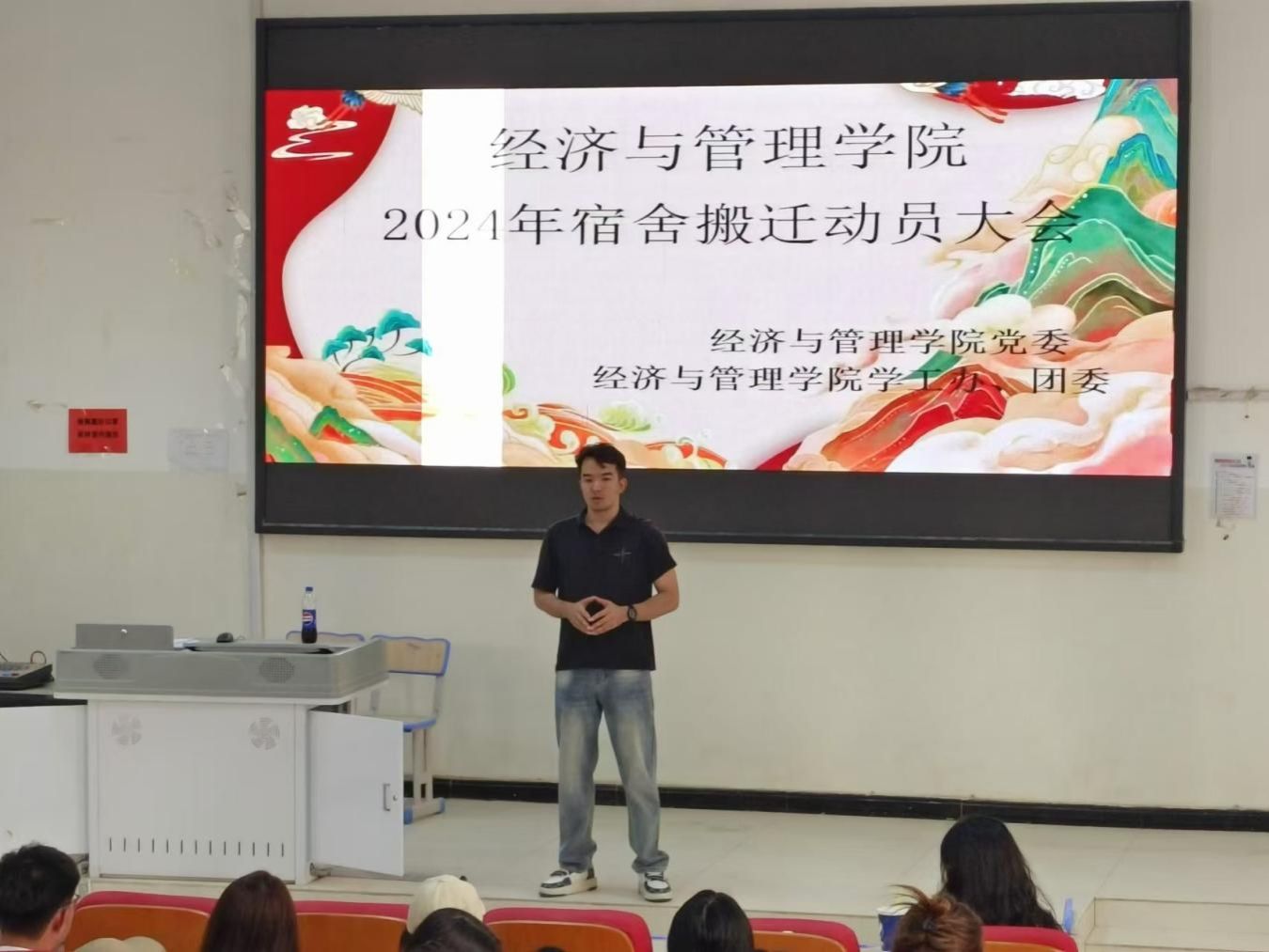 随着新学期的脚步日益临近,为了进一步优化学生住宿环境,确保每位同学都能在新环境中开启精彩的大学生活,经济与管理学院于2024年9月1日17:00在学院100报告厅隆重召开了2024年宿舍搬迁动员大会,全体辅导员及百余位志愿者共同参加。本次大会旨在统一思想、明确任务、凝聚力量,为即将到来的宿舍搬迁工作奠定坚实基础。
