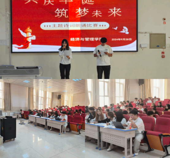 为展现当代大学生的文化素养与艺术风采,激发广大青年的爱国爱党情怀,经济与管理学院通过线上报名线下开展的方式,于2024年9月28日在经管楼100报告厅开展“共庆华诞 筑梦未来”主题诗词朗诵比赛。
