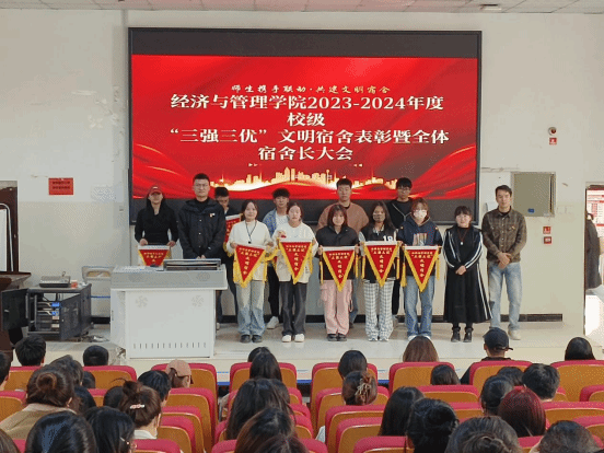 10 月 24 日,经济与管理学院在经管楼100 报告厅举行了2023 - 2024 年度校级“三强三优”文明宿舍表彰暨全体宿舍长大会。此次会议由学工办副主任贾贵娟老师主持,全体辅导员、22 、23 级全体宿舍长参加会议。