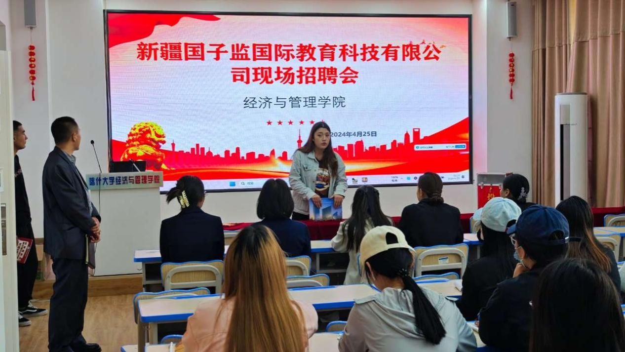 为贯彻党的二十大精神,响应国家对高校毕业生就业工作的高度重视,积极落实“稳就业、保民生”的战略部署,为广大毕业生提供更多的就业机会。为进一步深化校企合作,推动产学研深度融合,2024年4月25日,经济与管理学院党委副书记贺波与辅导员老师张国伟邀请新疆国子监国际教育科技有限公司到经管楼208进行招聘宣讲并协商后续校企合作相关事宜。